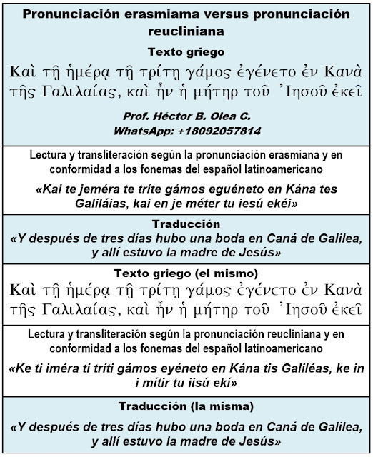 Por supuesto, con tal de hacer mucho más comprensibles estas líneas, invito a considerar la imagen anexa, con la cual voy a poner un ejemplo claro y concreto de las implicaciones de leer y transliterar un mismo texto griego según la pronunciación erasmiana y según la pronunciación reucliniana.